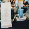 - Platzkarten (9 x 6,5 cm Glasmarkierer aus schwarz, weiß und gold verspiegeltem Acrylglas in 3 mm. Der Text wird in schwarz und weiß im UV Druck aufgedruckt. Die Platzkarten werden oben am Glas eingehängt.)